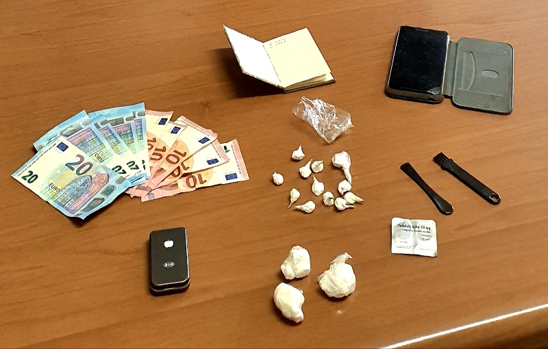 La perquisizione d’iniziativa presso l’abitazione, attivata sempre con l’ausilio del cane antidroga, permetteva di rinvenire nel bagno, occultata all’interno di un mobiletto, cocaina per circa 27 grammi, in parte già ripartita in dosi pronte alla vendita. Veniva rinvenuto e sequestrato, altresì, materiale funzionale al confezionamento dello stupefacente e 150 euro in contanti, in vari tagli, ritenuti proventi del reato di spaccio.