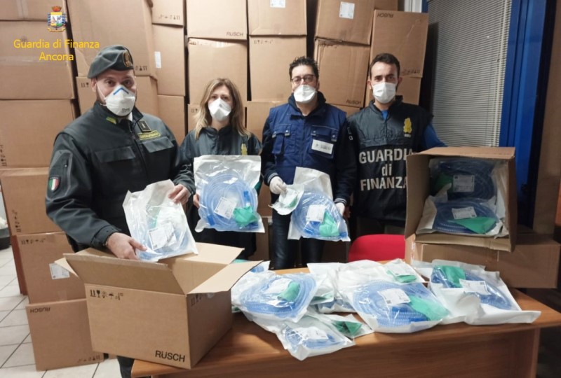 I finanzieri della Compagnia della Guardia di Finanza di Ancona, in collaborazione con i funzionari dell’Agenzia delle Dogane e Monopoli, nell’ambito dell’esecuzione di uno specifico piano di controlli finalizzato al rispetto dell’ordinanza della protezione civile che fa divieto alle imprese di cedere all’estero determinati dispositivi medici tra cui, in particolare, quelli di ventilazione utilizzati in terapia intensiva, sono riusciti a sequestrare ben milleottocentoquaranta circuiti respiratori – composti da tubo, pallone, valvola e maschera respiratoria – da utilizzare per i pazienti in condizioni critiche.