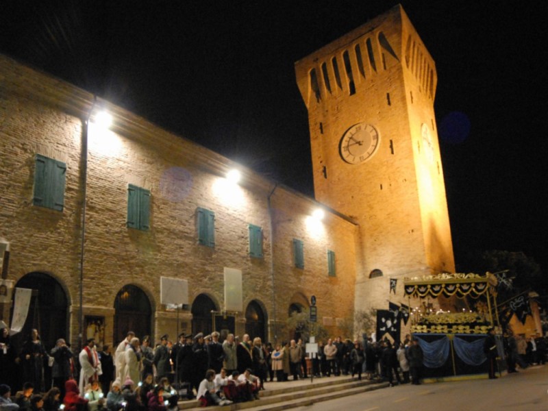 La celebrazione del Venerdì Santo inizia dal pomeriggio, con le Tre Ore di agonia, al cui termine si libera Cristo dalla croce, per porlo sopra la bara allestita, mentre la folla assiste assorta all’operazione. L’Ave Maria da poi inizio alla processione, guidata dalla grossa croce di legno, su cui spiccano gli strumenti della passione di Cristo: la corona di spine, i flagelli, la spugna imbevuta nell’aceto, la lancia, i dadi e i chiodi. Dodici (quanti gli apostoli) pescatori portorecanatesi (dal pittoresco nome di sciabbegotti) portano la bara, mentre i devoti fedeli circondano e seguono la processione, con le donne che iniziano ad intonare canti e preghiere tradizionali. Una seconda croce (ai piedi della quale è attorcigliata una catena) viene portata da tre pescatori incappucciati e scalzi: uno indossa una tunica bianca, gli altri due ne portano una nera, a rappresentazione di Gesù e dei due ladroni. La processione è chiusa da una portantina con tre statue, che raffigurano la Madonna, San Giovanni e Maria Maddalena, portata dai figli dei pescatori.