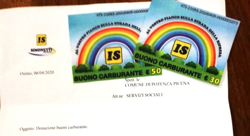 Ha donato due mila euro in buoni benzina da destinare alle famiglie che ne hanno piu’ bisogno. Così l’azienda Simonetti Petroli di Recanati ha voluto dare il suo contributo ad affrontare l’emergenza che stiamo vivendo. Si tratta di 65 vouchers da 30 euro ed uno da 50 euro, da destinare ad altrettanti cittadini in difficoltà. I Servizi Sociali del Comune assegneranno e distribuiranno i buoni benzina, contattando direttamente gli aventi diritto.