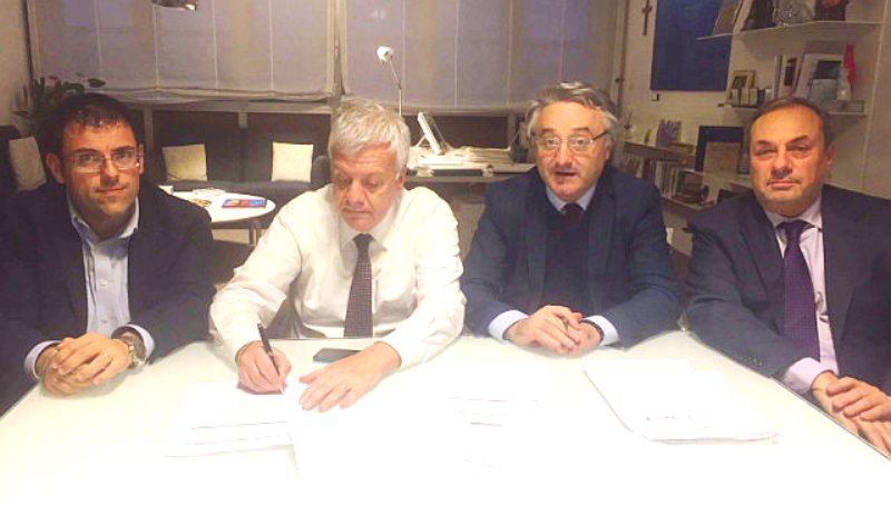 firma dell'accordo per il Colle dell'Infinito. da sinistra l'ex sindaco Fiordomo, l'ex ministro Galletti, l'asesssore regionale Sciapichetti e il consigliere regionale Marconi
