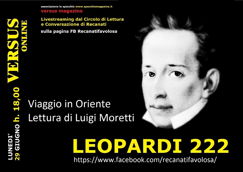 Anche l’associazione culturale Lo Specchio partecipa alle celebrazioni leopardiane in occasione del 222°anno della nascita del poeta. Attraverso una diretta social su fb sulla pagina Recanatifavolosa (https://www.facebook.com/recanatifavolosa), l’associazione proporrà, lunedì 29 giugno, giorno di nascita del poeta, alle ore 18,00 presso il Circolo di Lettura e Conversazione, una lettura leopardiana in livestreaming.