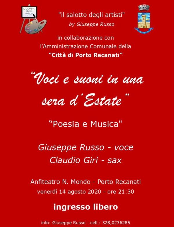 In collaborazione con l’Amministrazione Comunale della Città di Porto Recanati “il salotto degli artisti” presenta – venerdì 14 agosto 2020 alle ore 21:30 – il Recital di Poesia “Voci e suoni in una sera d’Estate” presso l’Anfiteatro Natale Mondo, C.so Persiani 141 – Porto Recanati.