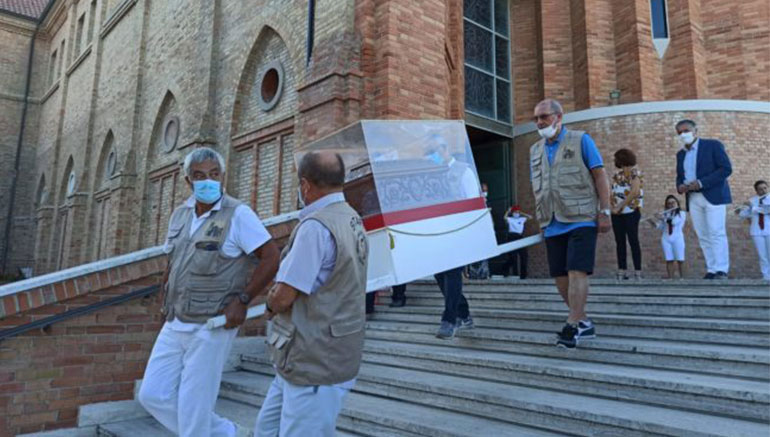 Ad accogliere l’urna del santo scortata in silenzio sopra ad un furgone, solo l’equipaggio di Braveheart e poche autorità: il sindaco, il presidente del consiglio, l’assessore all’istruzione e il comandante della Capitaneria di porto Giuliano Gentilini. La cerimonia per onorare il patrono San Marone si è svolta senza quel bagno di folla che solitamente accompagna la processione in mare. Un contesto anomalo per un rituale molto sentito dalla città e atteso ogni anno.