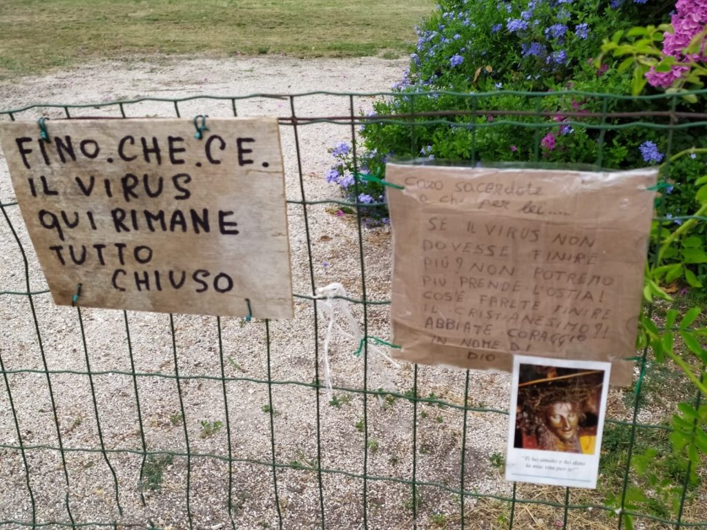 Una scelta difficile che effettivamente non ha trovato tutti i fedeli d’accordo tanto che una mano anonima ha commentato il suo disappunto su un pezzo di cartone appeso accanto a quell’avviso: “Caro sacerdote o chi per lei, se il virus non dovesse finire più? Non potremo più prendere l’ostia. Così farete finire il cristianesimo?! Abbiate coraggio in nome di Dio”. Sotto, per rendere più esplicito il suo messaggio, un santino con il volto di Cristo in croce con la corona di spine in testa.