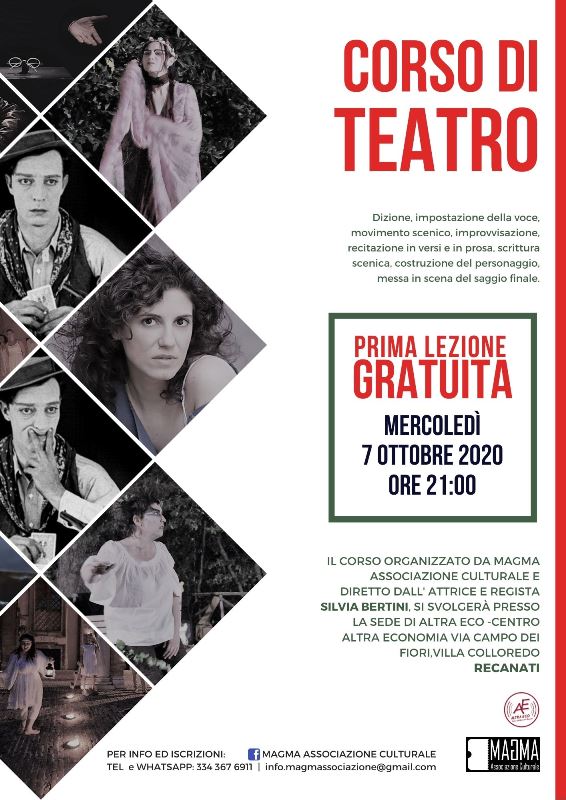 A Recanati, riparte il corso di Teatro organizzato da MAGMA Associazione Culturale presso la sede di Altra Eco, in via Campo dei Fiori. Mercoledì 7 Ottobre alle ore 21.00 vi sarà la prima lezione gratuita e aperta a tutti coloro che sono curiosi, attratti o desiderosi di tuffarsi nel mondo del teatro.