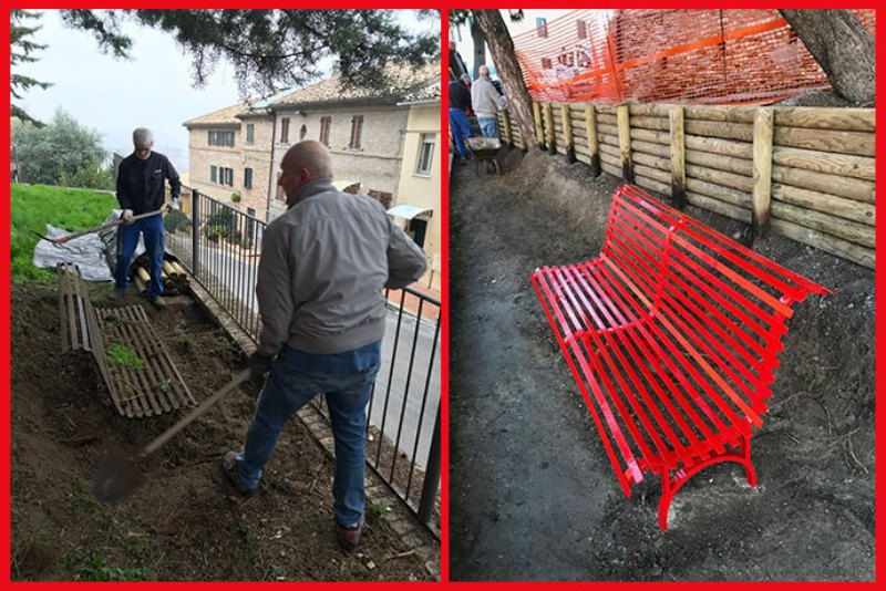 La panchina è frutto del recupero di una seduta sepolta dalla terra per effetto della pendenza, in un angolo scosceso vicino alla chiesa. L’angolo, in stato di abbandono, grazie al lavoro di alcuni volontari del rione – iscritti regolarmente al programma “Cittadinanza attiva” – è stato recuperato e messo in sicurezza dalla scarpata in frana con una staccionata in legno.