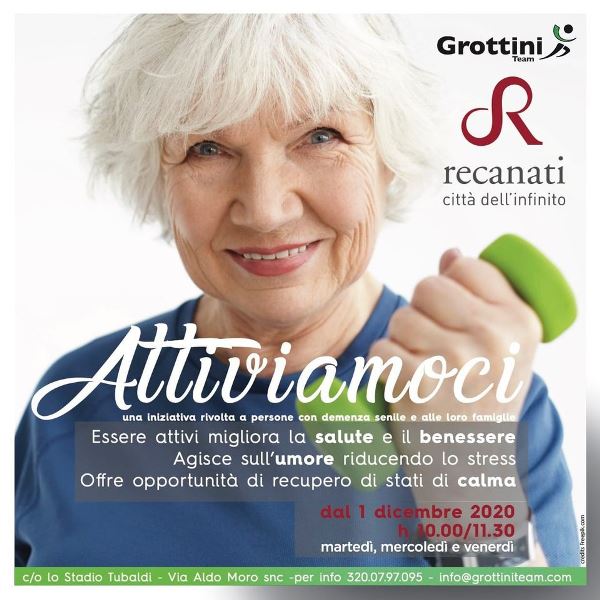Parte da domani a Recanati il nuovo servizio a favore delle persone affette da malattie quali l’Alzheimer. Infatti l’Associazione Sportiva “Grottini Team” di Recanati, grazie alla collaborazione dell’Amministrazione Comunale, darà vita al progetto “Attiviamoci – Teniamoci attivi 2020/2021″ con l’obiettivo di offrire ai cittadini anziani affetti da demenza, soggetti ad isolamento e solitudine, soprattutto in questo particolare periodo pandemico data l’interruzione di molti servizi socio-sanitari, un’occasione di socialità e attività psicomotoria in sicurezza in un contesto protetto e con personale preparato.