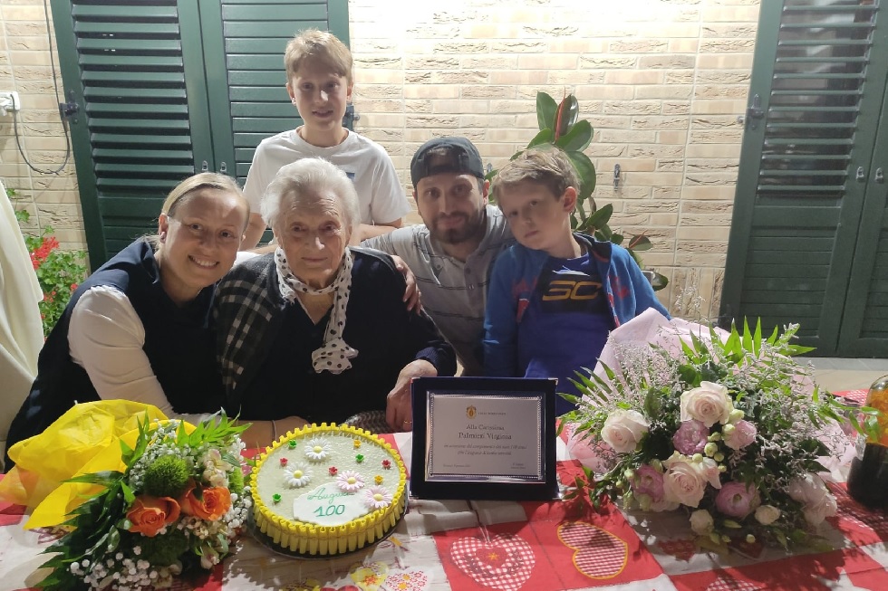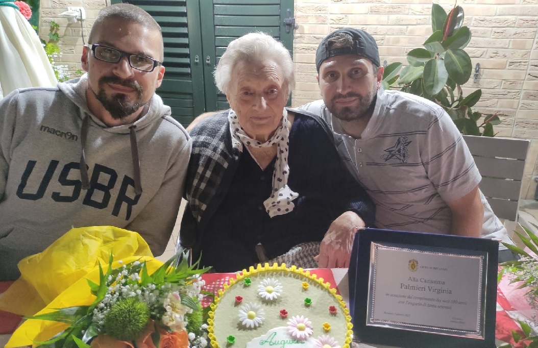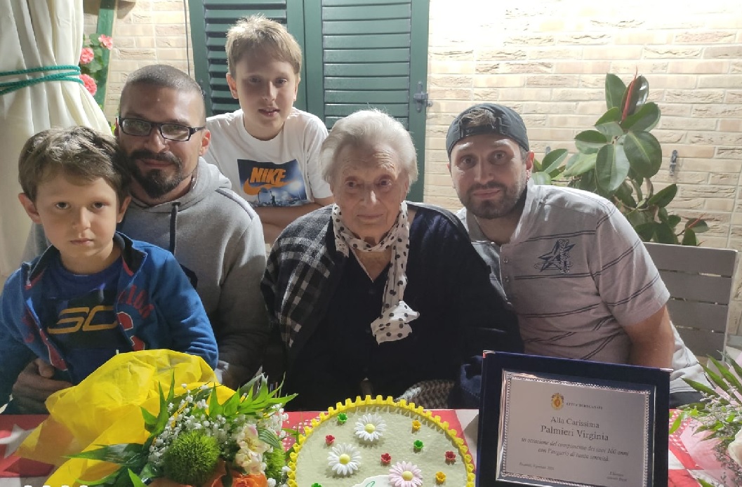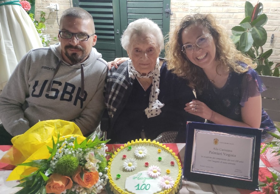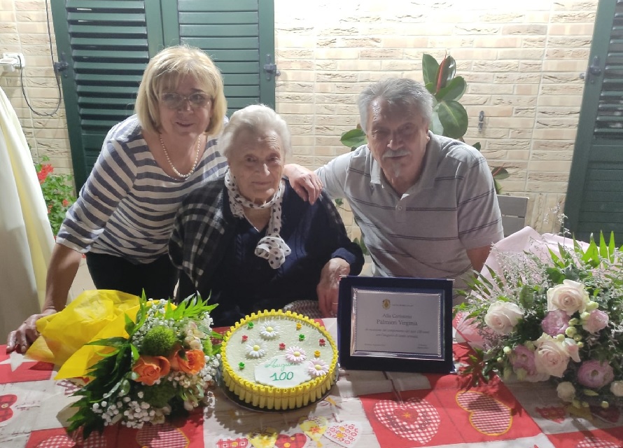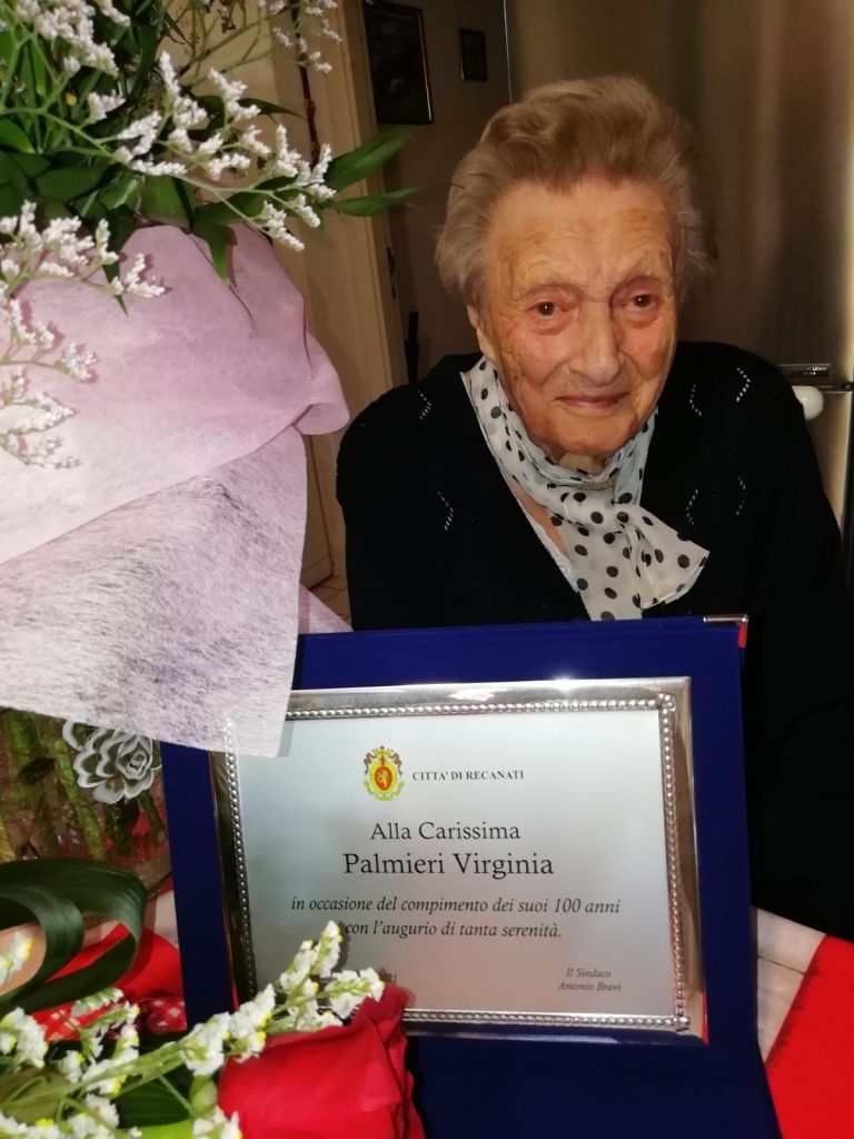Ha compiuto 100 anni la recanatese Virginia Palmieri, vedova Tridenti: mercoledì ha tagliato un bel traguardo della sua vita confortata dall’affetto di tutti i suoi cari: il figlio Giuliano, i nipoti e i pronipoti. Nella festa organizzata a casa, in via Nazario Sauro, non sono mancati neanche gli auguri dell’Amministrazione comunale che ha omaggiato la nonnina con un bel mazzo di fiori e una targa ricordo.