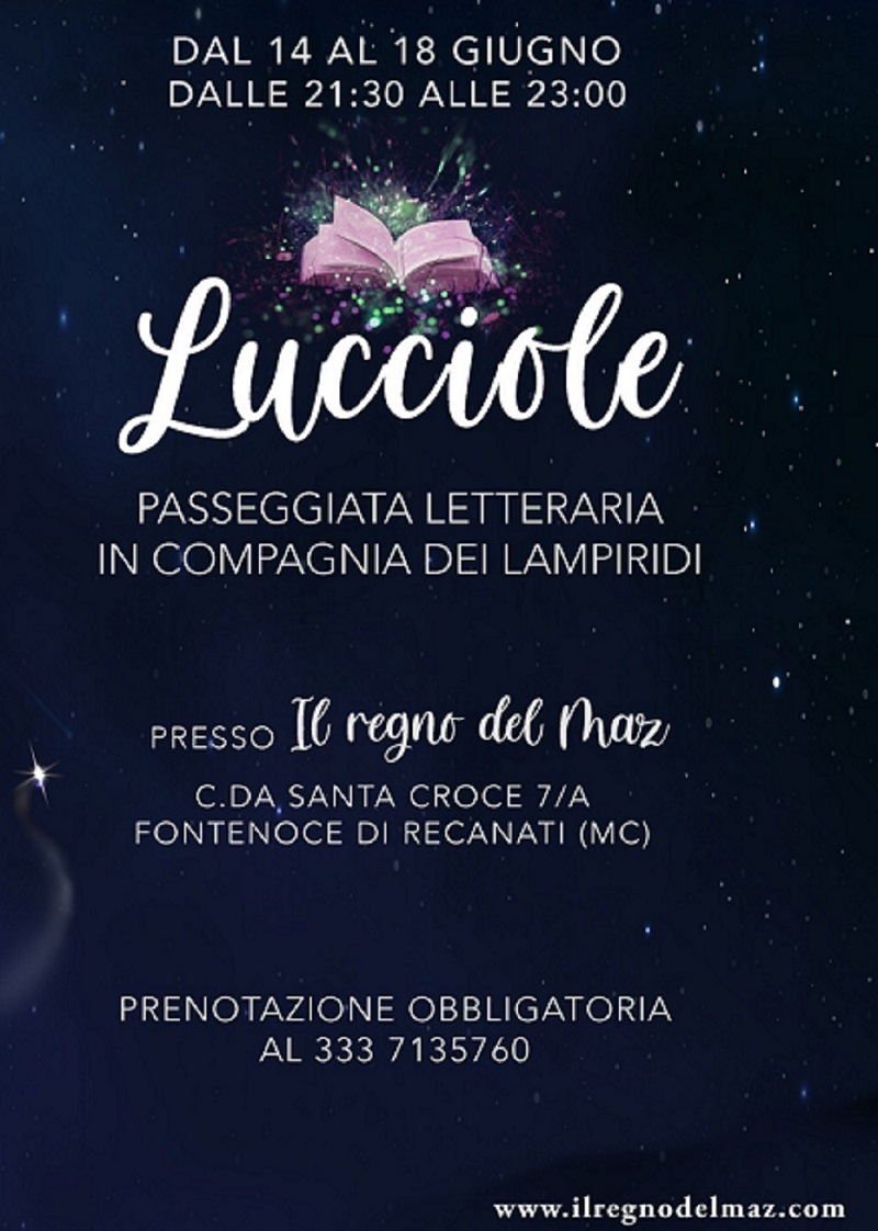 Questo è il periodo delle lucciole, e in un’oasi di pace e tranquillità la casa editrice Giaconi Editore organizza “Lucciole – Passeggiata Letteraria”, evento che da lunedì 14 a venerdì 18 giugno, dalle 21:30 alle 23:00, vi porterà a scoprire il magico mondo dei lampiridi attraverso suggestive letture nel contesto magico de “Il Regno del Maz” a Fontenoce di Recanati, sede della casa editrice, che prende il nome dal famoso folletto Mazzamurello, creatura della leggenda tradizionale marchigiana, e ispirato al libro “Il Bosco delle Lucciole” di Barbara Cerquetti.