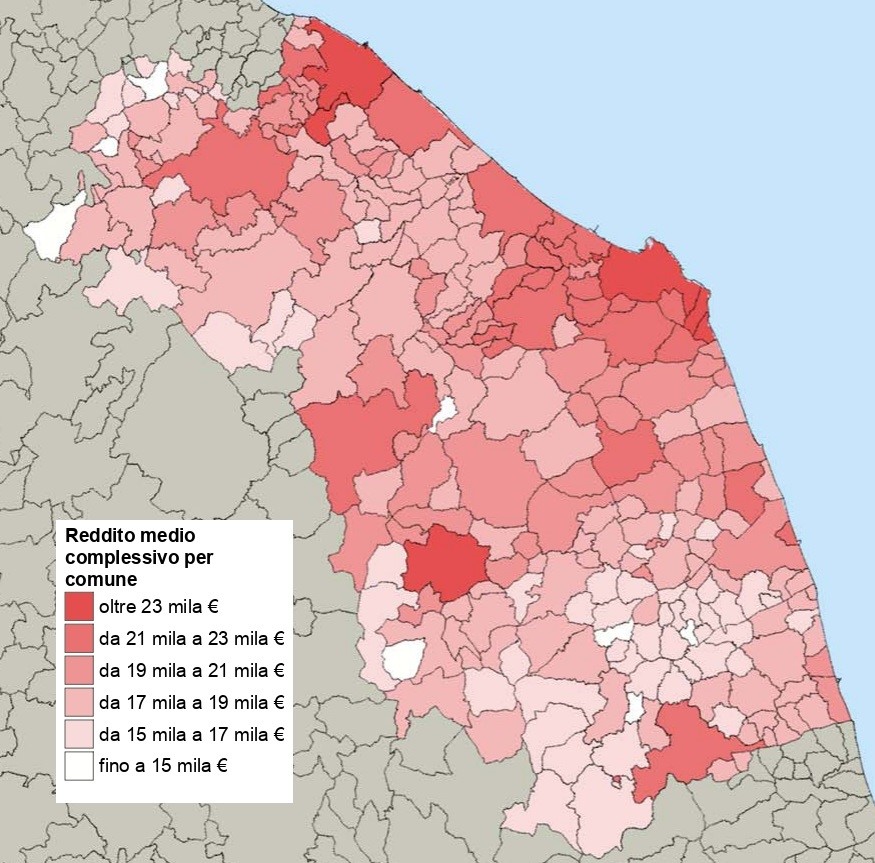 I redditi medi dei marchigiani sono inferiori sia alla media nazionale (21.853 euro) che alla media delle regioni del Centro (22.061 euro). Nella graduatoria delle regioni italiane, le Marche si collocano al 12° posto e ultime delle regioni del Centro. Significative le differenze di reddito tra le diverse realtà territoriali e in particolare tra le aree urbane cosi come tra le realtà della costa e le aree interne a partire da quelle colpite dal sisma 2016.