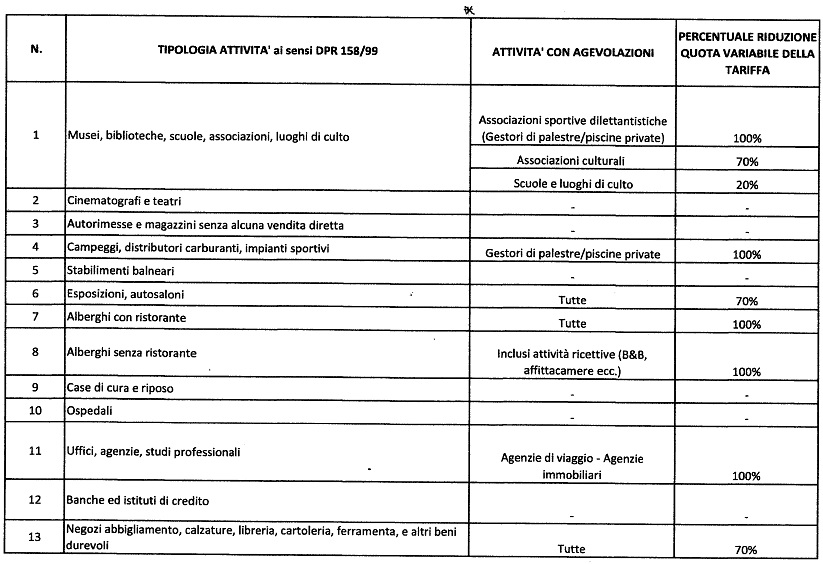 Tenuto conto delle difficoltà che tutte le attività economiche hanno incontrato per via della pandemia e delle relative restrizioni, l’amministrazione ha deciso di devolvere circa 170.000 euro per far fronte alle minori entrate che deriveranno dalla tari concedendo cospique riduzioni, anche del 100%, sulla parte variabile della tassa sui rifiuti.