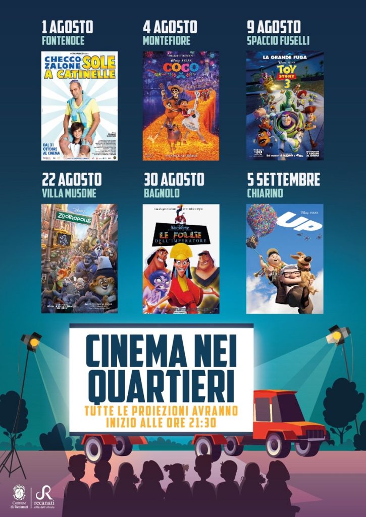 Queste le date, le location e le proiezioni dei film che inizieranno alle 21,30 della nuova iniziativa comunale “Cinema nei quartieri”: si parte il 1 agosto a Fontenoce con il film di Checco Zalone “Sole a catinelle”, il 4 agosto sarà la volta del quartiere di Montefiore ad ospitare il grande cinema con “Coco” prodotto dalla Disney e della Pixar, il 9 agosto a Spaccio Fuselli si potrà vedere “La grande fuga Toy Story 3”, il 22 agosto a Villa Musone verrà proiettato “Zootropolis” diretto da Byron Howard e Rich Moore, il 30 agosto a Bagnolo “Le follie dell’Imperatore” e il 5 settembre a Chiarino “Up” il film prodotto dalla Disney in collaborazione con la Pixar.