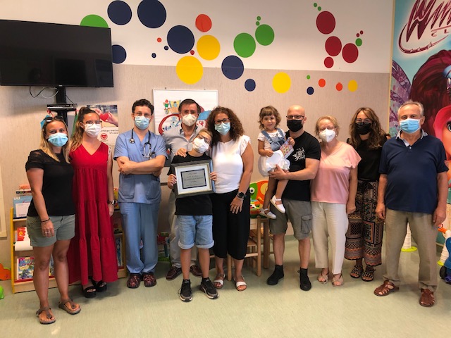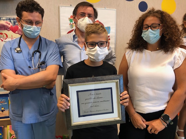Ieri la famiglia è stata accolta nella sala giochi del reparto dal Dr. Marco Pozzi, Dr. Luigi Arcieri dalle mamme del Comitato Chiara Mormile e Irene Camilletti e dai professionsiti Dr. Pupozzi ( alias Walter Caccioppola ) e Dr.ssa Annalisa Cannarozzo. In onore di Giordano sarà affissa una bellissima targa nella sala giochi del reparto di Cardiochirurgia pediatrica e congenita.