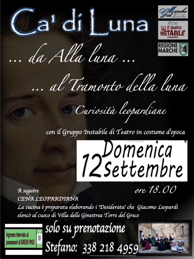 Si terrà presso la Fattoria Ca’ di Luna a Recanati, il 12 settembre con inizio h 18.00 (già sospeso x maltempo del 25 agosto), un interessante evento che coniugherà poesia e cucina. Si tratta del progetto del Gruppo Instabile di teatro di Recanati che è partito nel 2017 in set teatrali itineranti intorno al Colle dell’Infinito e nei luoghi leopardiani. Poi si è interrotto per le vicende della Pandemia