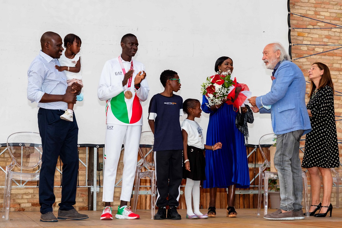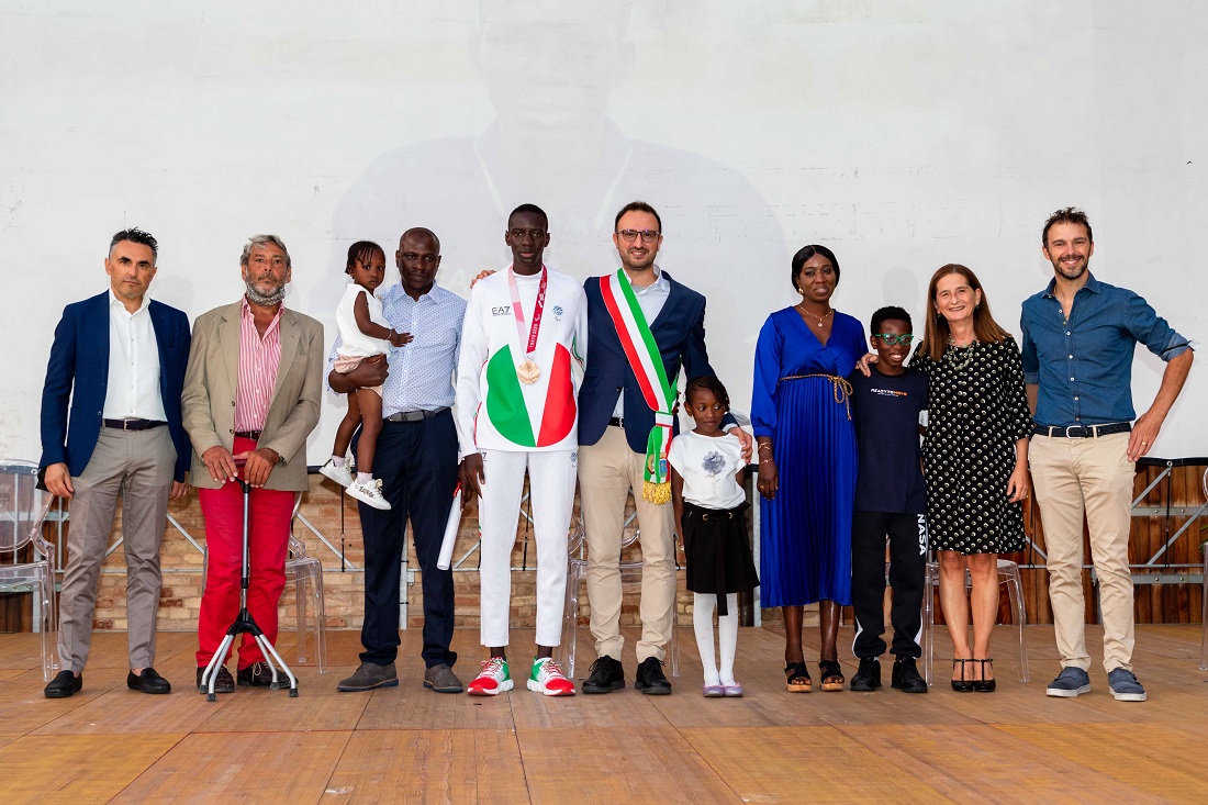 Ndiaga Dieng, per tutti “Cenga”, nel corso di una festa di popolo voluta dall’amministrazione comunale e dal Sindaco Leonardo Catena, è stato accolto in un bagno di folla ieri pomeriggio (sabato) nel piazzale delle Clarisse, nel cuore del centro storico di Montecassiano. La sua Montecassiano, dove vive nella frazione di Sambucheto, e i tanti che hanno imparato a conoscerlo in questi mesi in cui progressivamente si è sempre più parlato delle sue gesta sportive, fino allo scorso 3 settembre quando alle 3,13 della notte tantissimi sportivi e non si sono incollati alla televisione per seguire quei 1500 metri, specialità in cui il 21enne originario del Senegal va come un treno. E così è stato anche in quella notte giapponese, in quella che è stata ribattezzata dagli addetti ai lavori una delle più belle performance dell’intera Paralimpiade di Tokyo 2020, conquistando un bronzo meraviglioso. “Attualmente è lo sportivo di Montecassiano più forte di tutti i tempi – ha detto il Sindaco Catena orgoglioso del suo concittadino e della sua famiglia, mamma Nabou e papà Malick, che non si stancano mai di ringraziare tutti “per le opportunità che avete dato al nostro ragazzo”.
