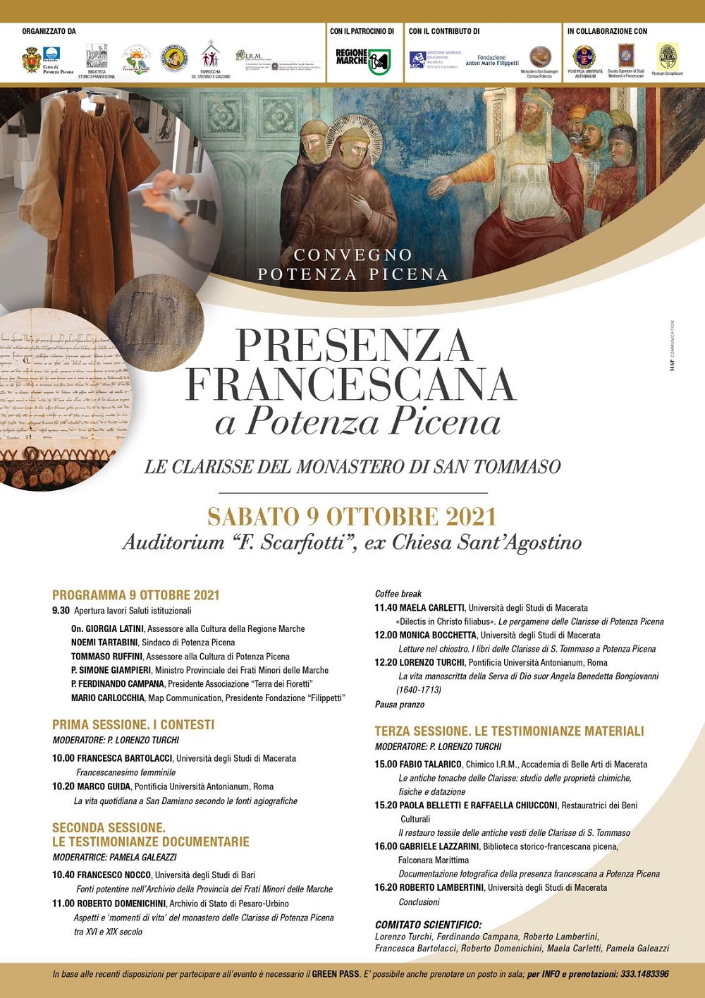 Sabato 9 ottobre ore 9,30 si terrà a Potenza Picena, presso l’Auditorium Ferdinando Scarfiotti, il convegno “Presenza francescana a Potenza Picena”. La manifestazione culturale, che vede coinvolti diversi partners ed istituzioni, raccoglie i risultati dei lavori e degli studi svolti sui manufatti tessili e le pergamene del Monastero delle Clarisse, che per l’occasione saranno esposte.