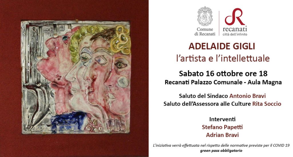 Sabato 16 ottobre 2021 alle ore 18.00 presso l’Aula Magna del Palazzo Comunale di Recanati si terrà la conferenza sull’artista Adelaide Gigli (5 giugno 1927 – 14 ottobre 2010) per proseguire il progetto di studio iniziato a marzo di quest’anno con l’evento on line dal titolo “Esposte – Arte e condizione femminile”.