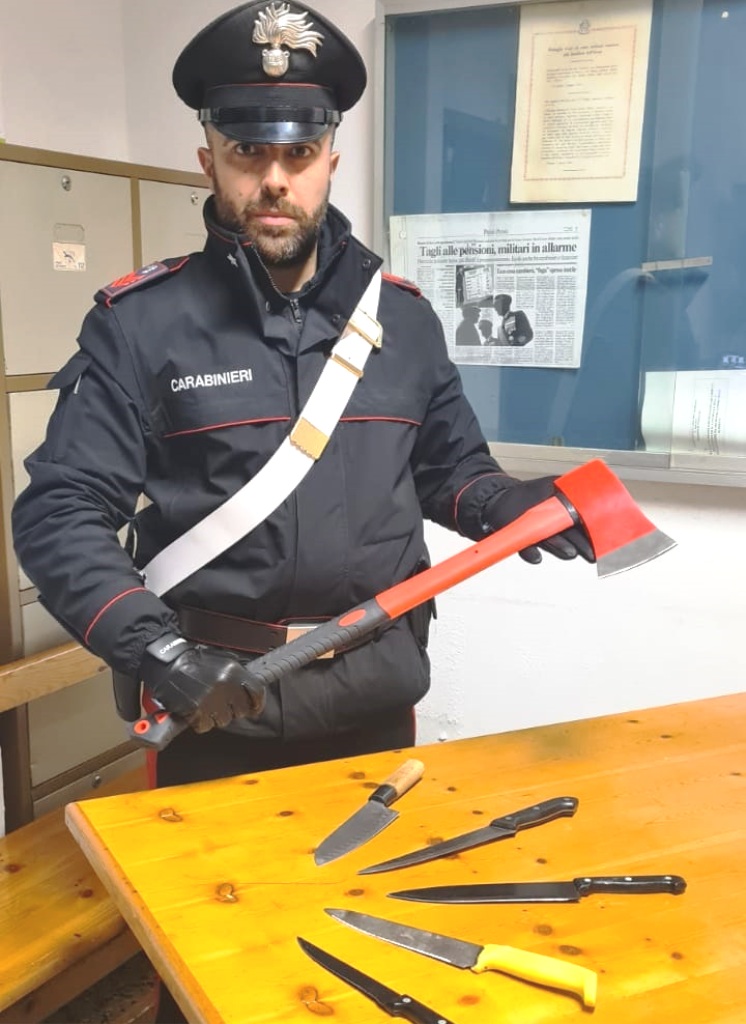 L’ascia, della lunghezza di cm.70 e peso di 1,4 kg acquistata poco prima in un negozio della zona, è stata sequestrata insieme a 5 coltelli da cucina di grosse dimensioni trovati nella sua abitazione a seguito di perquisizione.