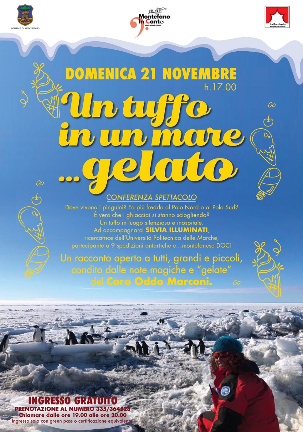 Nel pomeriggio, alle ore 17.00, sempre in Teatro, Silvia Illuminati – Ricercatrice dell’Università Politecnica delle Marche partecipante a nove spedizioni antartiche e montefanese DOC – presenta “Un tuffo in un mare…Gelato!”. La Conferenza-Spettacolo è un racconto aperto a tutti, grandi e piccini, accompagnato dalle note magiche e “gelate” del Coro “Oddo Marconi” di Montefano. L’ingresso è gratuito previa prenotazione al numero 335-364528.
