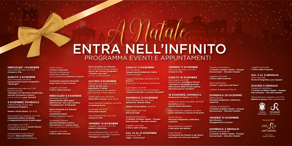 Domenica 19 dicembre dalle ore 17 Natale a Porta Marina e al Castello di Montefiore; alle ore 18 all’Auditorium del Centro Mondiale della Poesia concerto della pianista Ottavia Maria Maceratini e alla stessa ora in Piazza Giacomo Leopardi, esibizione del Corpo bandistico del Comune di Recanati. L’intera giornata sarà animata nel centro storico dai mercatini di artigianato e hobbistica, mercatino del baratto e dalle Piazzette dei Mestieri e dei Sapori con i laboratori di cucina per bambini e dal Gioco delle Soprese. Nel salone del popolo a cura della Cosmari appuntamento con “Laboratori del Riuso” e con “L’Albero di Natale con Riciclo”