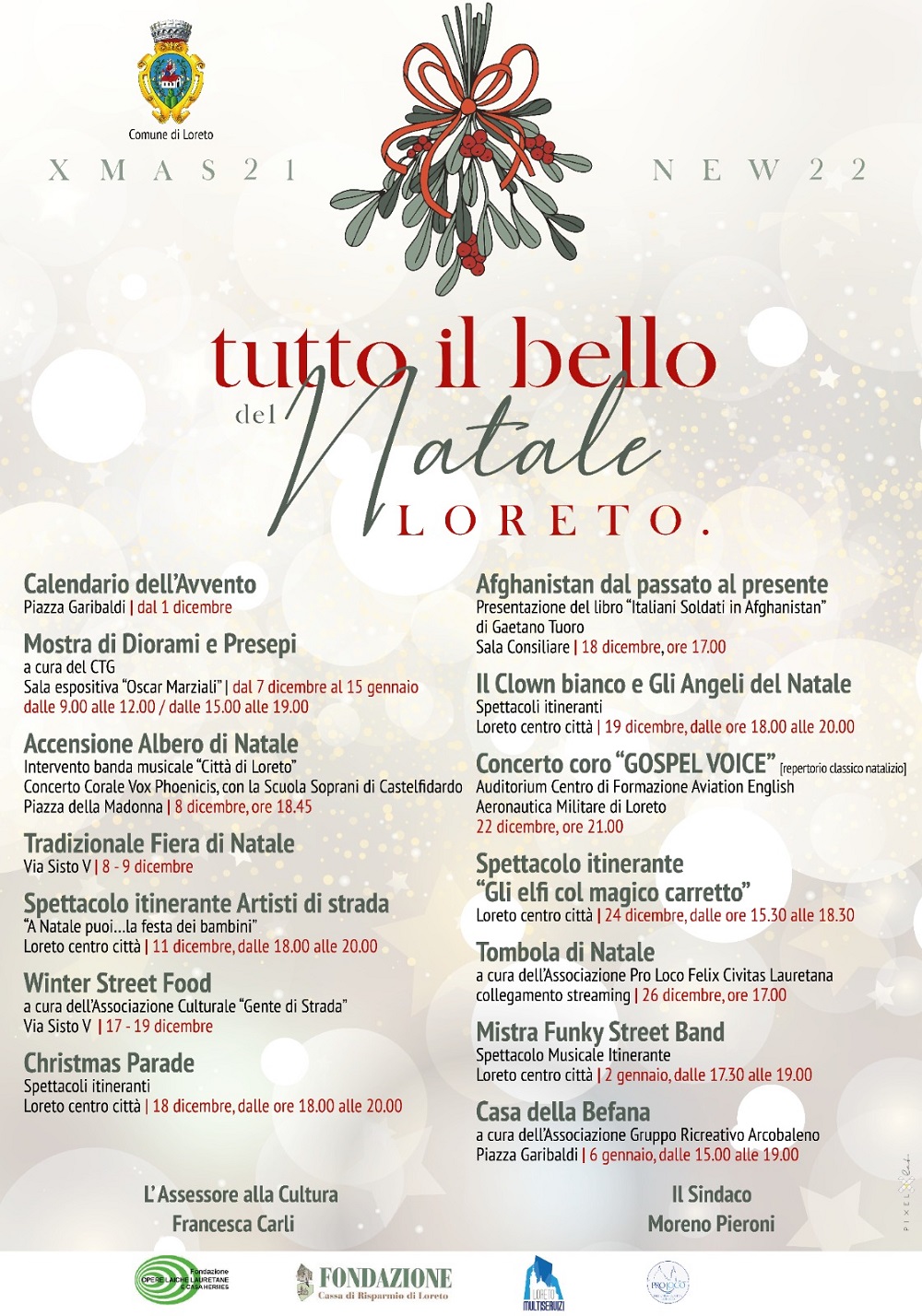 Unico appuntamento al chiuso è il Concerto Gospel di Natale, che si terrà la sera del 22 dicembre presso l’Auditorium del Centro di Formazione ‘Aviation English’ dell’Aeronautica Militare di Loreto. Per il resto, grande magia per le vie della città: si parte dall’accensione dell’albero di Natale nel giorno dell’Immacolata, addobbato grazie al contributo della Fondazione Opere Laiche Lauretane ed accompagnato dalle voci del coro ‘Vox Phoenicis con la Scuola Soprani di Castelfidardo, per gentile contributo della Fondazione Carilo. Un evento che fa da corollario anche alle attese feste mariane dell’Immacolata e della Madonna di Loreto, che cade il 10 dicembre.