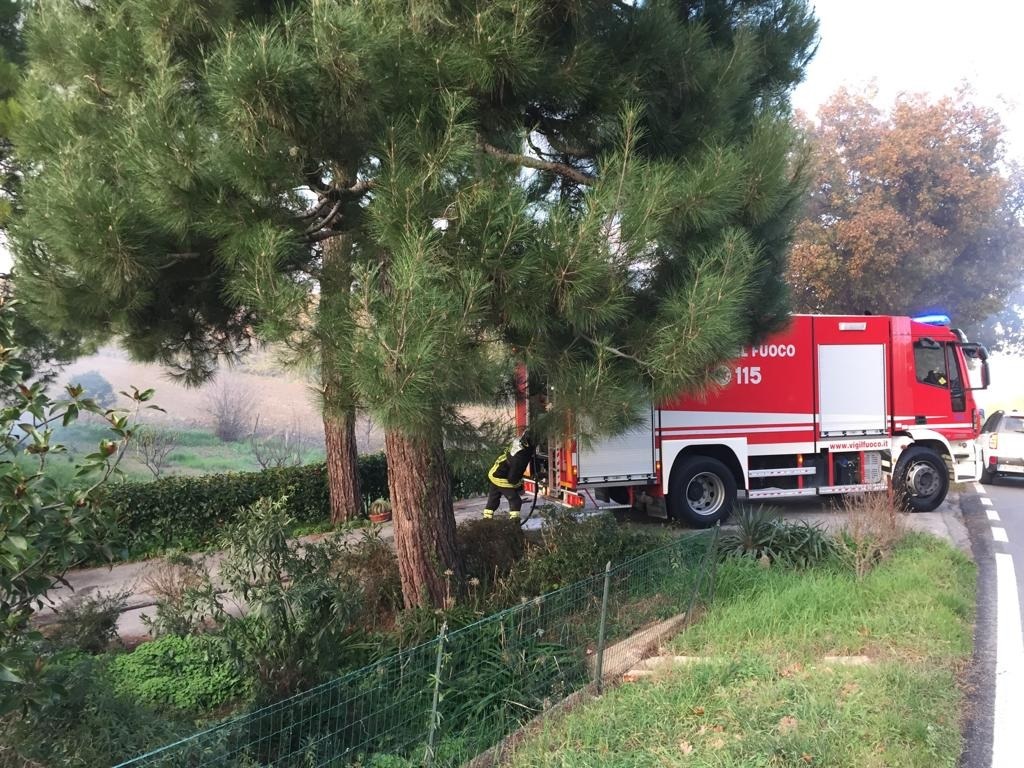 Incendio nel primo pomeriggio di oggi in via Brecce località Loreto, la strada che dalla rotatoria nei pressi della Raimbow conduce a Villa Musone