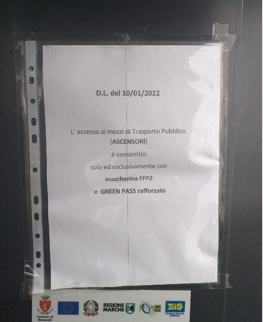 È comparso un cartello sulla porta degli ascensori di Porta San Domenico e del parcheggio del Centro Città che ne vieta l’uso a chi non è munito di mascherina FFP2 e di green pass rafforzato.