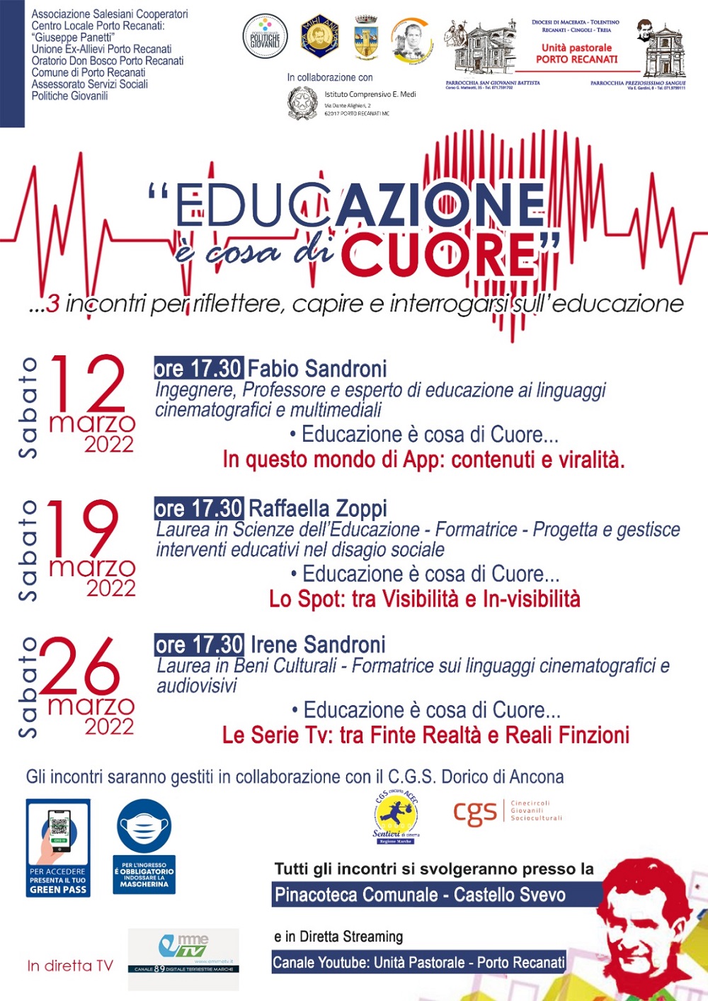 Tutti gli incontri si terranno alla Pinacoteca comunale al Castello Svevo, con inizio alle 17.30, e verranno trasmessi in diretta televisiva da EmmeTv, canale 189 del digitale terreste, e in diretta streaming sul canale YouTube Unità Pastorale – Porto Recanati.