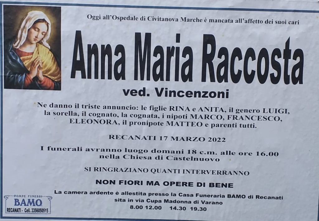 E’ morta Anna Maria Raccosta ved. Vincenzoni