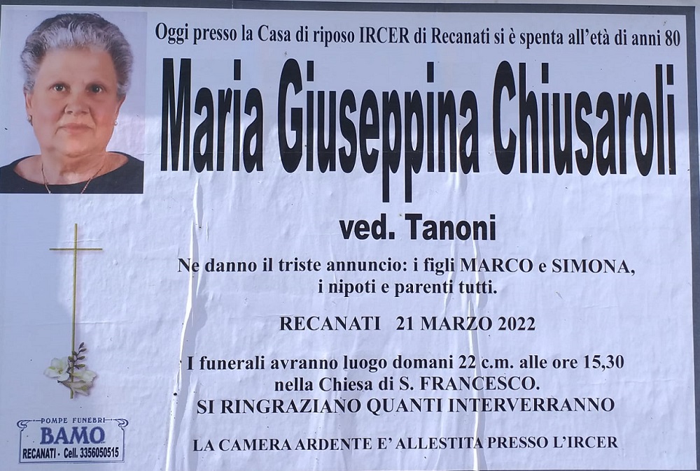 E’ morta Maria Giuseppina Chiusaroli ved. Tanoni