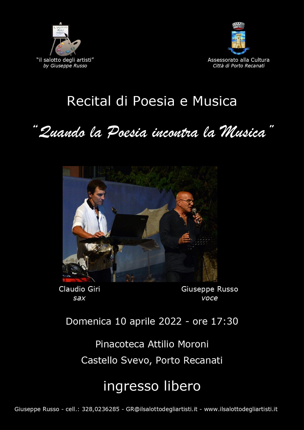 Autori che hanno fatto la grandezza della poesia e della musica costituiranno un eccellente cibo per la nostra anima durante il Recital di poesia e musica, che si terrà nella prestigiosa Sala della Pinacoteca Attilio Moroni, Castello Svevo, Porto Recanati (MC).