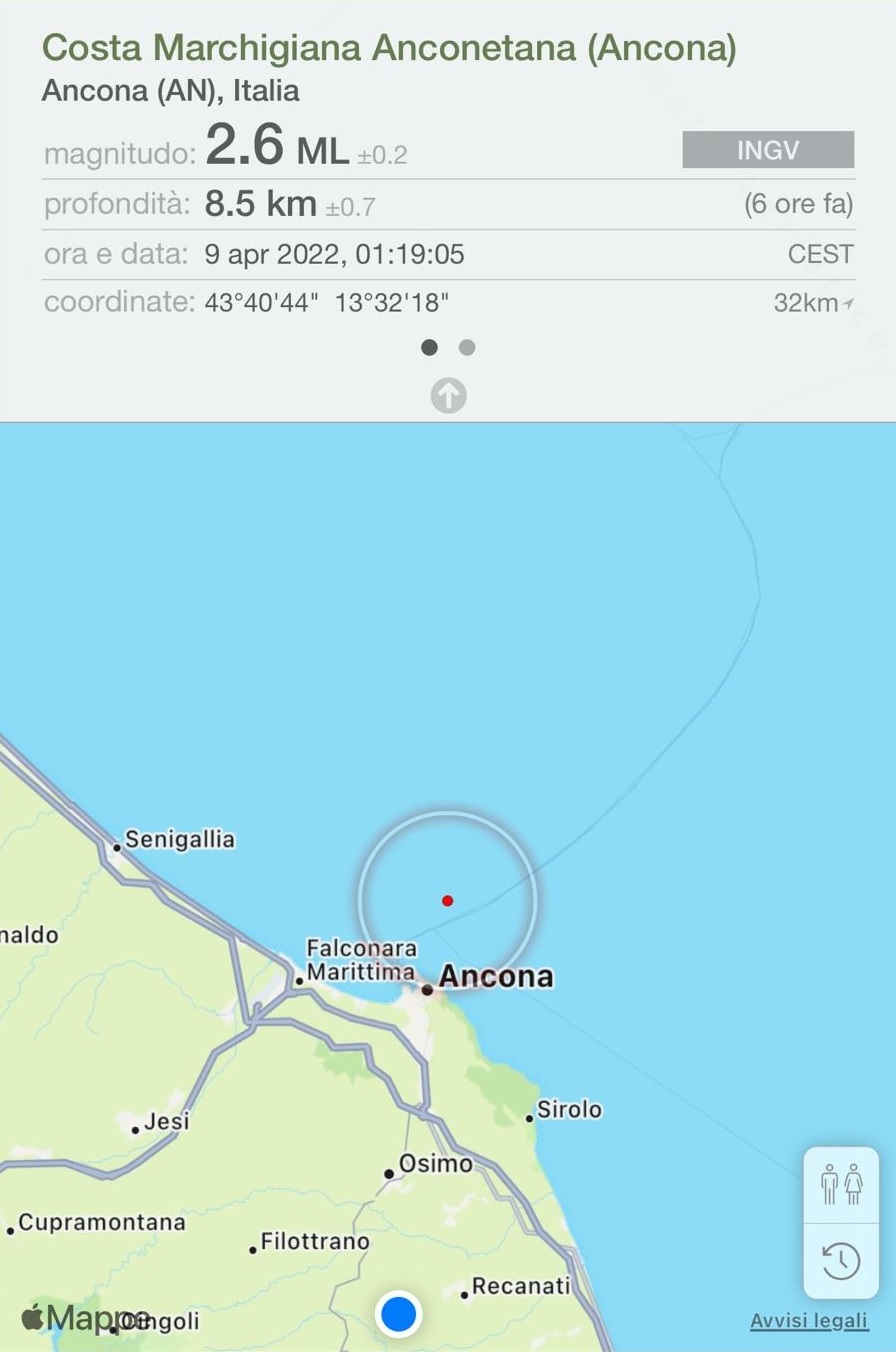 Secondo l’Ingv si tratta di una scossa di magnitudo 2.6 con epicentro al largo della costa marchigiana, davanti ad Ancona, ad una profondità di 8 chilometri.