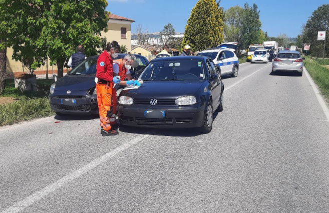 Tamponamento fra tre auto, due Volkswagen Golf e una Fiat Punto. L’incidente è avvenuto nel primo pomeriggio di oggi lungo la ex statale 77 subito dopo lo stabilimento Clementoni in località Fontenoce.