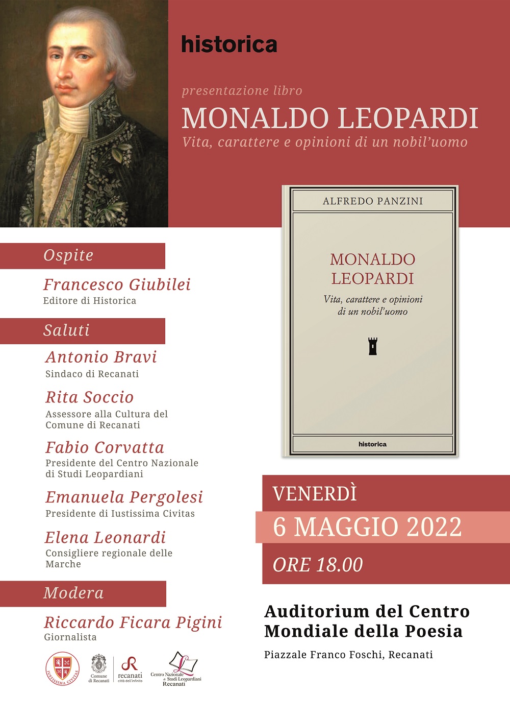 L’evento è patrocinato dal Comune di Recanati, dal Centro Nazionale di Studi Leopardiani e dall’Associazione Iustissima Civitas, interessata a ridare lustro alla storia di questo interessante personaggio recanatese. Ospite della serata sarà l’editore Francesco Giubilei. Saranno presenti il Sindaco di Recanati Antonio Bravi, l’Assessore alla Cultura Rita Soccio, il Consigliere regionale Elena Leonardi, il Presidente del Centro Nazionale di Studi Leopardiani Fabio Corvatta e la Presidente di Iustissima Civitas Emanuela Pergolesi. Modererà l’incontro Riccardo Ficara Pigini.