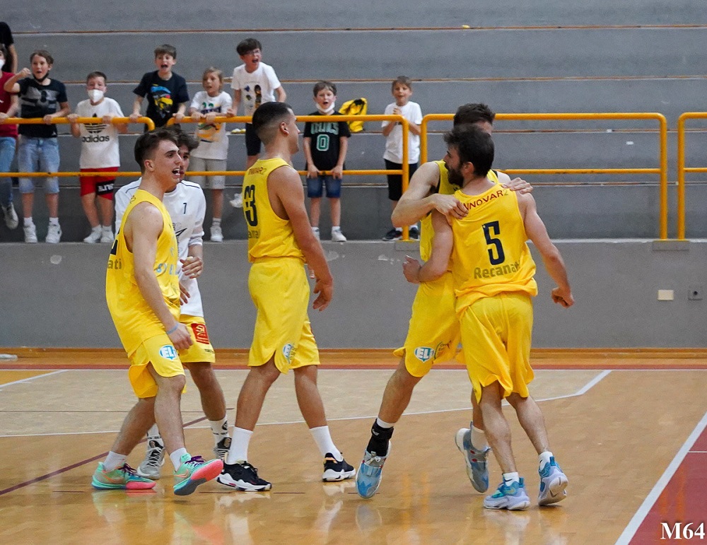 In apertura di gara è Raschi-show, il numero 11 biancoblu è letteralmente scatenato perforando la retina avversaria sia dal perimetro che in avvicinamento. La Svethia soffre tantissimo a rimbalzo ma chiude sotto di 4 (20-24) dando l’impressione nonostante tutto di esserci. I secondi dieci minuti di gara differiscono poco da quanto visto nei primi: San Marino sfrutta i sempre più numerosi secondi possessi mentre Recanati si aggrappa ad uno strabordante Chiorri vero trascinatore dei suoi. All’intervallo è 33-40 Titans. Il terzo quarto è quello che dà la svolta ad un match che si fa via via sempre più acceso: San Marino mette la freccia raggiungendo anche la doppia cifra di vantaggio, Principi e compagni rispondono con la verve di Gelsomini e di un Pezzotti ispirato dall’arco. Recanati spinta dalla grinta di Ottaviani e Sabbatini ci crede e sfrutta l’inspiegabile nervosismo che serpeggia tra gli ospiti, alla terza sirena è 52-53 con un match ora totalmente riaperto. E’ vero clima playoff al PalaBellini, Raschi prova a prendere per mano i suoi, sponda Svethia cresce la convinzione di poter compiere l’impresa. Chiorri subisce fallo su tiro da tre punti a 11″ dalla fine, la guardia dorica dalla lunetta è glaciale e regala l’overtime ai suoi: 67-67. Recanati nell’appendice ne ha di più e sfrutta la freschezza di Sabbatini e Leonardo Palmieri, San Marino con Altavilla fuori per cinque falli si aggrappa all’eterno Raschi, è però Chiorri con un palleggio arresto e tiro vincente a regalare il successo ad una Svethia che mercoledì alle 21.00 raschierà il barile delle energie fisiche e mentali per prolungare ancora la sua stagione. Finisce 77-75, Recanati è viva e ci crede.