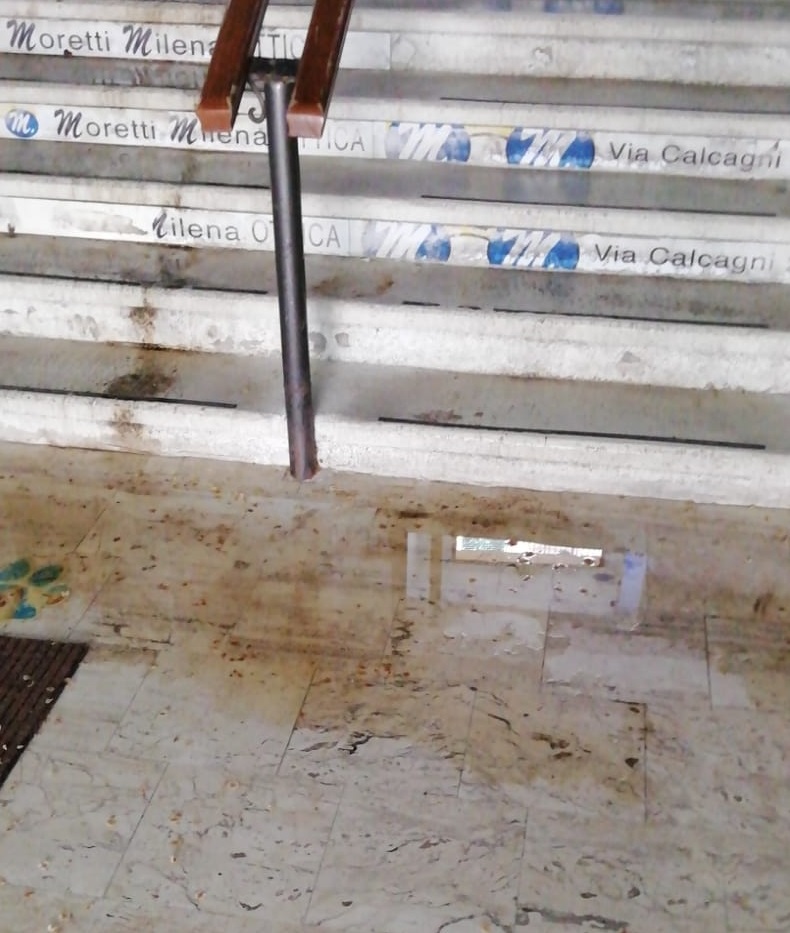 Ancora è ritornata ad essere di nuovo imbrattata di scritte varie e graffiti la scalinata interna della Multisala Sabbatini che collega vicolo Alemanni con la sottostante via Battisti (ex SS77) e che porta anche alla sala cinematografica Gigli. Qui viene anche segnalato da più cittadini, che utilizzano quel passaggio pedonale, che al termine della scalinata è sempre presente una grossa pozzanghera d’acqua mista a terriccio che mette a rischio la sicurezza dei pedoni, soprattutto delle persone più anziane.