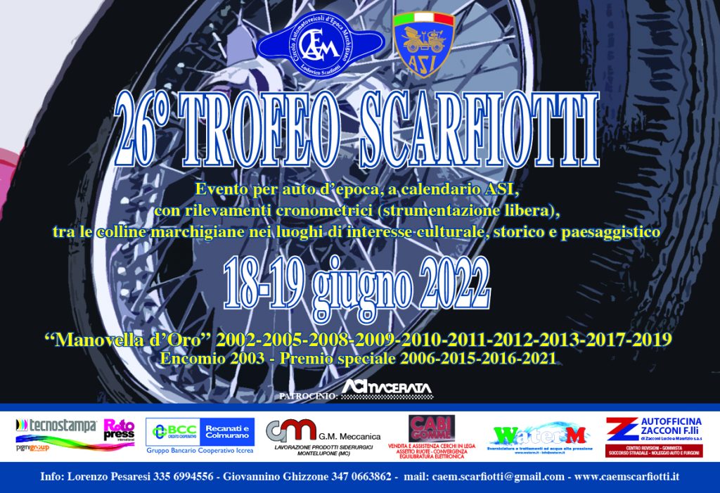 Lo staff organizzatore del CAEM/Scarfiotti ha il supporto di Tecnostampa, Rotopress, GM Meccanica, Ca.Bi. Gomme, Autofficina F.lli Zacconi, Water M, Ristorante La Marchigiana e Re Norcino.