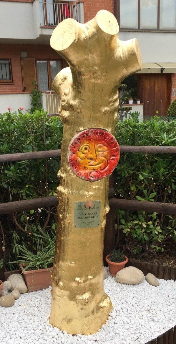 Il tronco, prendendo ispirazione dall’opera d’arte “l’Arbre d’Or” situata nella foresta Brocéliande (Paimpont, Francia), creata da François Davin nel 1991 e sponsorizzata dal famoso collezionista d’arte Pinault (avessimo noi qui mecenati del genere!), è stato così trasformato dal Comitato Quartiere Castelnuovo in una sorta di monumento che con la sua presenza straniante e imprevista rende più fiabesco il parco giochi. Le piante hanno un ruolo all’interno delle fiabe e delle tradizioni di qualunque popolo, per questo il ceppo, diventato secco, invece di essere reciso è stato recuperato e convertito in una sorta di “portale” che abbia la capacità di stimolare la nostra immaginazione.