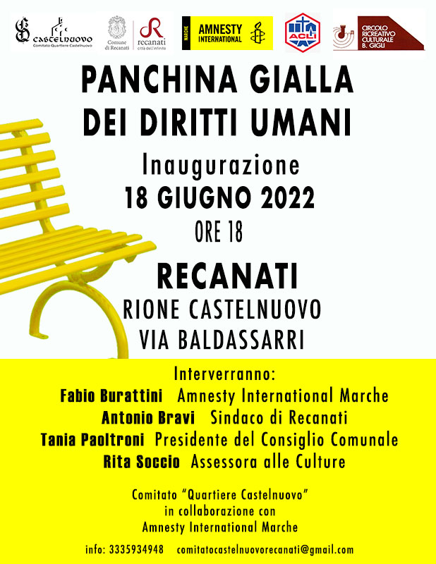 Sabato 18 giugno 2022 alle 18.00 a Recanati nel Rione Castelnuovo con la partecipazione di Amnesty International sarà inaugurata la panchina gialla dei Diritti Umani per indicare la loro importanza e il pericolo della loro assenza in modo da tenere viva l’attenzione sulle ingiustizie che continuano a consumarsi in tutto il mondo.