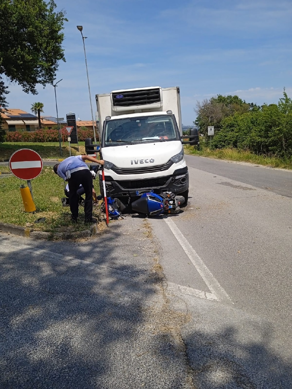 Incidente stradale all’incrocio fra via del Mare e via Nazario Sauro, ex statale 77. Coinvolto un furgono Iveco, che proveniva in direzione mare-monti e una moto Aprilia alla cui guida un ragazzo di 16 anni del luogo che viaggiava verso il mare. Dinamica al vaglio della Polizia Municipale che è intervenuta sia per i rilievi che per regolare il traffico che è stato per molti minuti deviato. I due mezzi sono venuti in collisione e la moto è finita nella parte anteriore del furgone incastrandosi fra le due ruote.