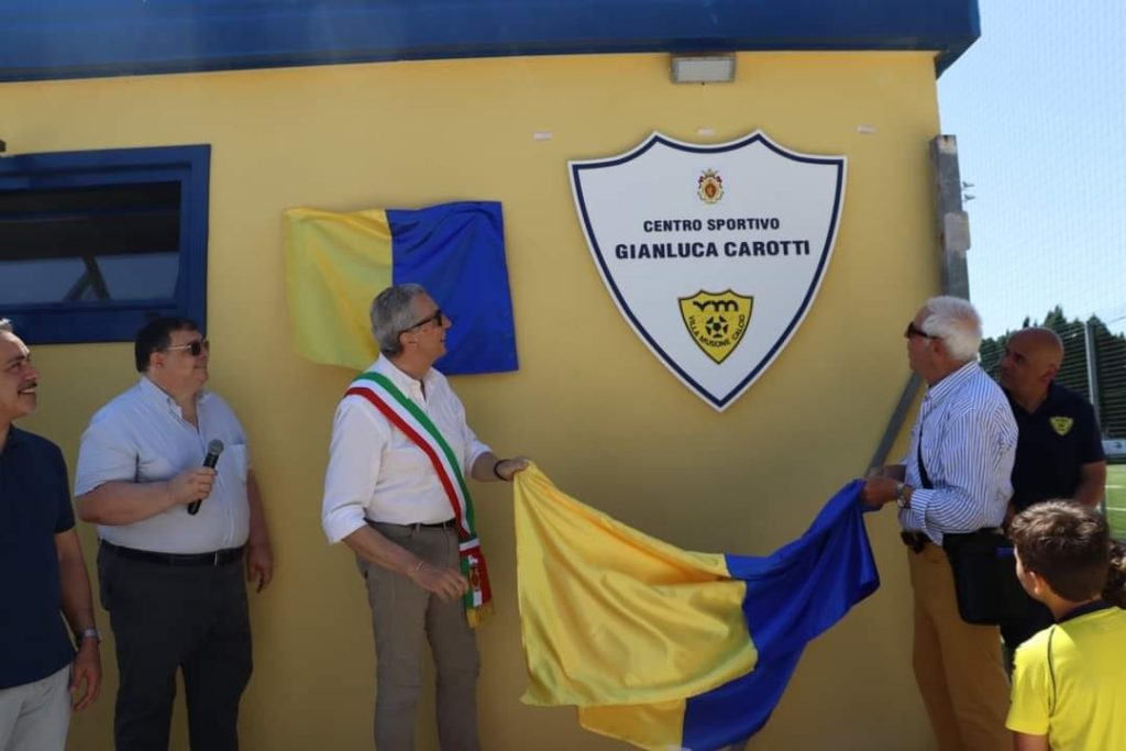 Nella mattinata di domenica 26 Giugno si è svolta la cerimonia di intitolazione dello stadio di Via Turati, casa dei villans, all’indimenticato Gianluca Carotti. Un percorso cominciato un paio d’anni fa, con l’avvallo dell’Amministrazione Comunale di Recanati, fortemente voluto dalla società gialloblu e, dopo il rallentamento a causa delle restrizioni covid, si è finalmente arrivati alla conclusione di questo iter per ricordare il nostro caro Gianluca tragicamente scomparso insieme alla compagna Elisa del Vicario.