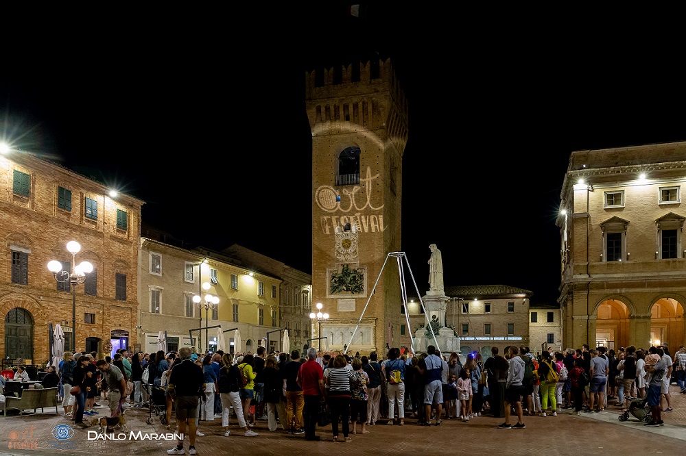Torna a far parlare di sé Art Festival Recanati, con la prima serata, quella di venerdì 8 luglio, che ha riportato per il sesto anno le emozioni delle arti performative nel centro storico leopardiano. Superate le incertezze del vento forte che avrebbe reso impossibili alcuni spettacoli e alcune assenze causa covid, la serata è iniziata regolarmente con le prime repliche di performance artistiche che come sempre hanno saputo coinvolgere gli spettatori presenti. Ognuno con il proprio stile e con la propria disciplina, gli artisti hanno saputo creare una magia unica: Gli Heat Fandango a Piazzale Giordani ed Elli de Mon presso i giardini B. Gigli hanno letteralmente scosso il pubblico con i loro due live intensissimi e pieni di energia; Umberto Rosichetti e la sua comicità contagiosa nel Cortile di Palazzo Venieri; la Compagnia MitiMuti, che con la trasposizione in chiave moderna delle Metamorfosi di Ovidio, ha ridato vita ad uno dei miti più antichi della storia, quello di Ercole; la Compagnia acrobatica aerea Revolè in Piazza Leopardi e il suo rocambolesco “Cabaret in aereo”, Silvia Valenti e Roberta Cipollone di Compagnia Circostanze e il loro spettacolo Floreo destinato a tutti quelli che non si arrendono mai di fronte alla difficoltà, Damiano Massaccesi alle prese con la paternità del suo “Orazio”, portato in anteprima ad Art Festival lungo Corso Persiani, Claudio Pisa e Laura de Nicolao dei Fabula Saltica con il loro spettacolo “fisico” ispirato al Bacio di Rodin, i Quetzalcoatlfuego con la potenza delle loro percussioni, che insieme al rituale del fuoco hanno chiuso la serata in Piazza Leopardi.