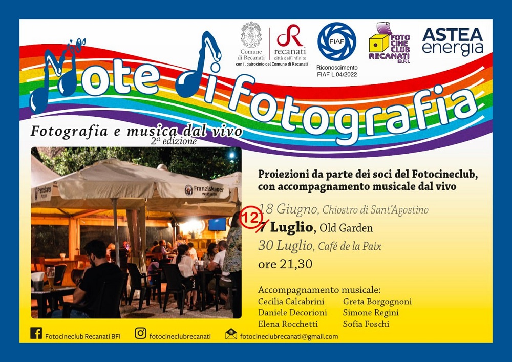 Il maltempo del 7 Luglio ci ha purtroppo costretto ad annullare la serata. Decisi a non mollare, riproponiamo il secondo appuntamento per il 12 Luglio alle 21:30 presso l’ “Old Garden” di Recanati con nuove proiezioni video dei soci del Fotocineclub di Recanati, accompagnate da giovani artisti della musica.