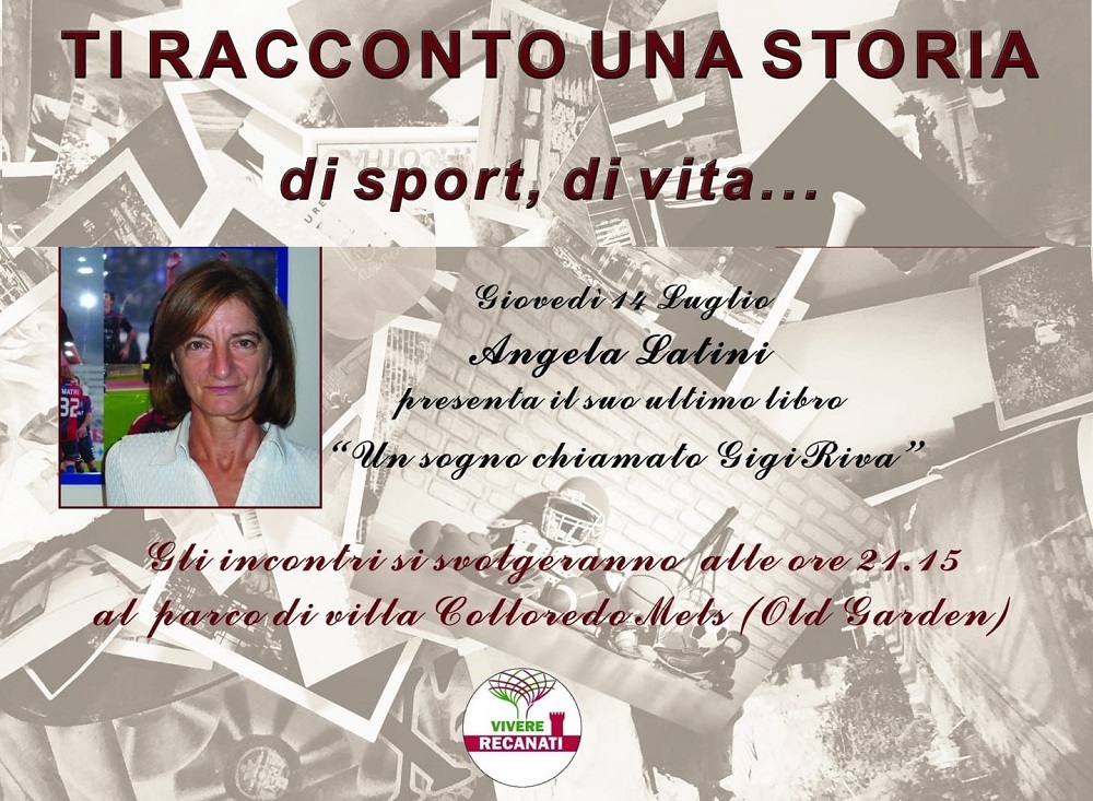 Si chiude giovedì sera a Villa Colloredo la serie di incontri estivi promossi dal Movimento Vivere Recanati. Dopo le serate con Alessandro Sbaffo e Giuseppe Pierini nel ricordo di Attilio, è prevista alle 21,30 presso l’Old Garden la presentazione del libro di Angela Latini “Un sogno chiamato Gigi Riva”.