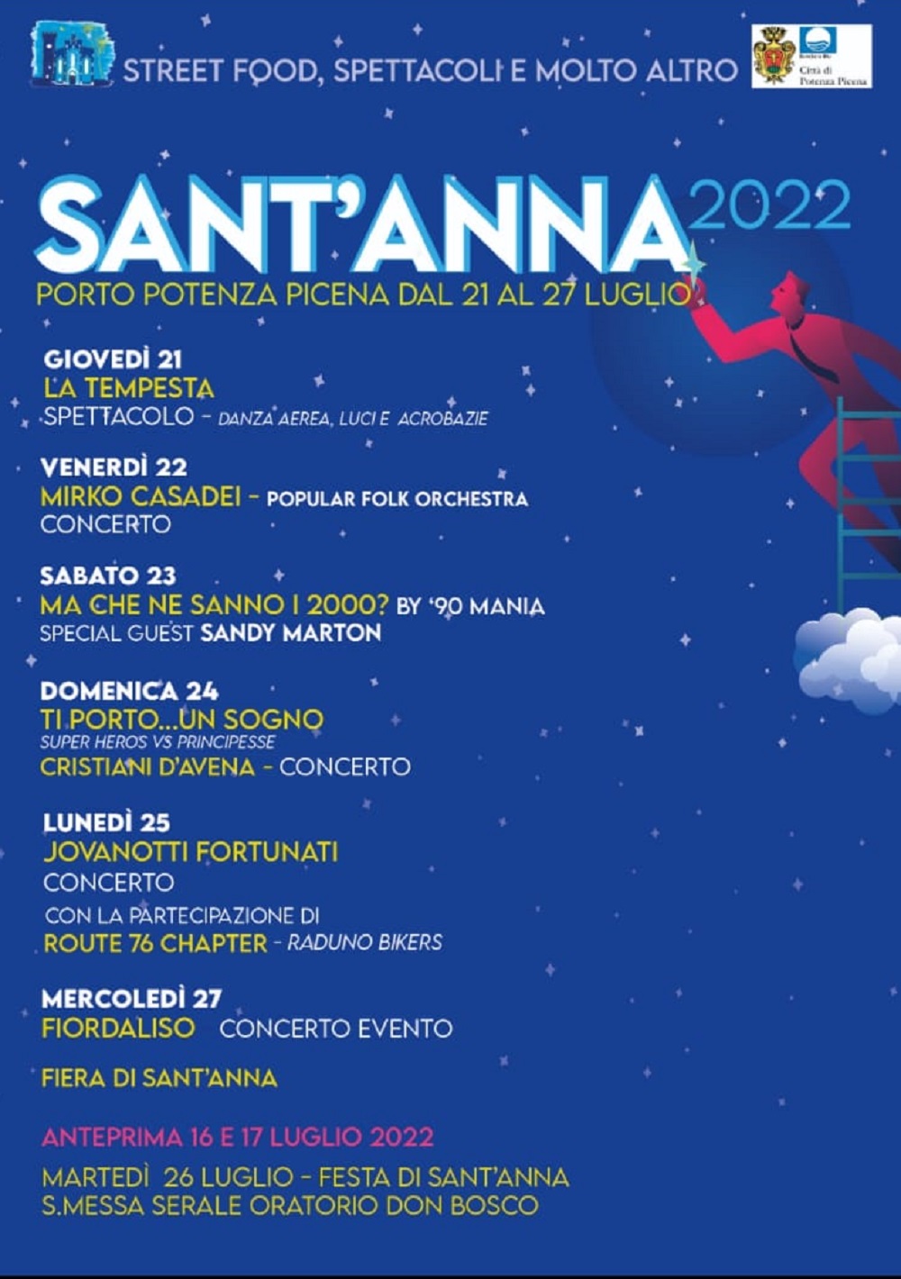 Aprirà la festa una piacevole “Anteprima” di sabato sera 16 luglio, con l’irresistibile gruppo comico “Gli Instabili”, che proseguirà domenica sera 17 con la Compagnia “Oratorio 3P”; la festa vera e propria prenderà, poi, il via giovedì sera 21 luglio con un fantastico spettacolo “La Tempesta” (danza aerea, luci e acrobazie), per proseguire nelle sere successive con la musica dell’orchestra Casadei, (venerdì 22), “Ma che ne sanno i 2000?” e Sandy Marton (sabato 23), evento “Ti Porto… un sogno!” con Principesse Super Eroi ed i Cristiani d’Avena… (domenica 24), la cover di Jovanotti “Jovanotti Fortunati” e il Raduno Bikers “Route 76 Chapter” (lunedì 25) e per finire con il concerto di Fiordaliso (mercoledì 27), in occasione del quale ci sarà anche l’estrazione finale dei premi della lotteria di Sant’Anna che anche quest’anno regalerà, ai più audaci nell’acquistare i biglietti, numerosi bellissimi premi (1° premio un’automobile). Il retrobiglietto dà inoltre diritto a sconti in alcuni negozi del paese e al buono spesa presso il locale supermercato “Coal di Via Emilia” e presso il Coal di Montelupone.