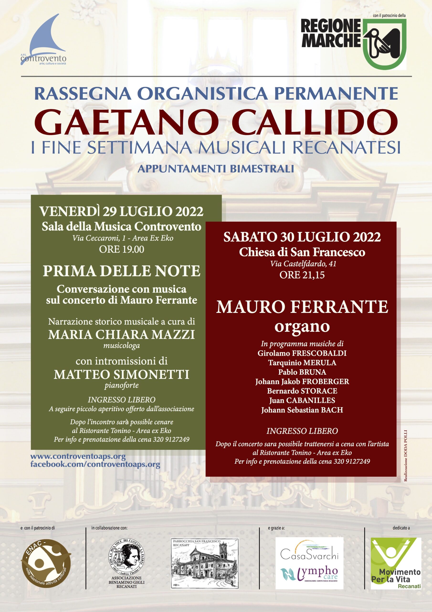 Prenderà il via a Recanati, nell’ultimo fine settimana di luglio, la Rassegna Organistica Permanente GAETANO CALLIDO organizzata dall’Associazione Controvento APS con il patrocinio della Regione Marche, la collaborazione con la Parrocchia San Francesco, l’Associazione Beniamino Gigli e il Centro Aiuto alla Vita di Recanati.