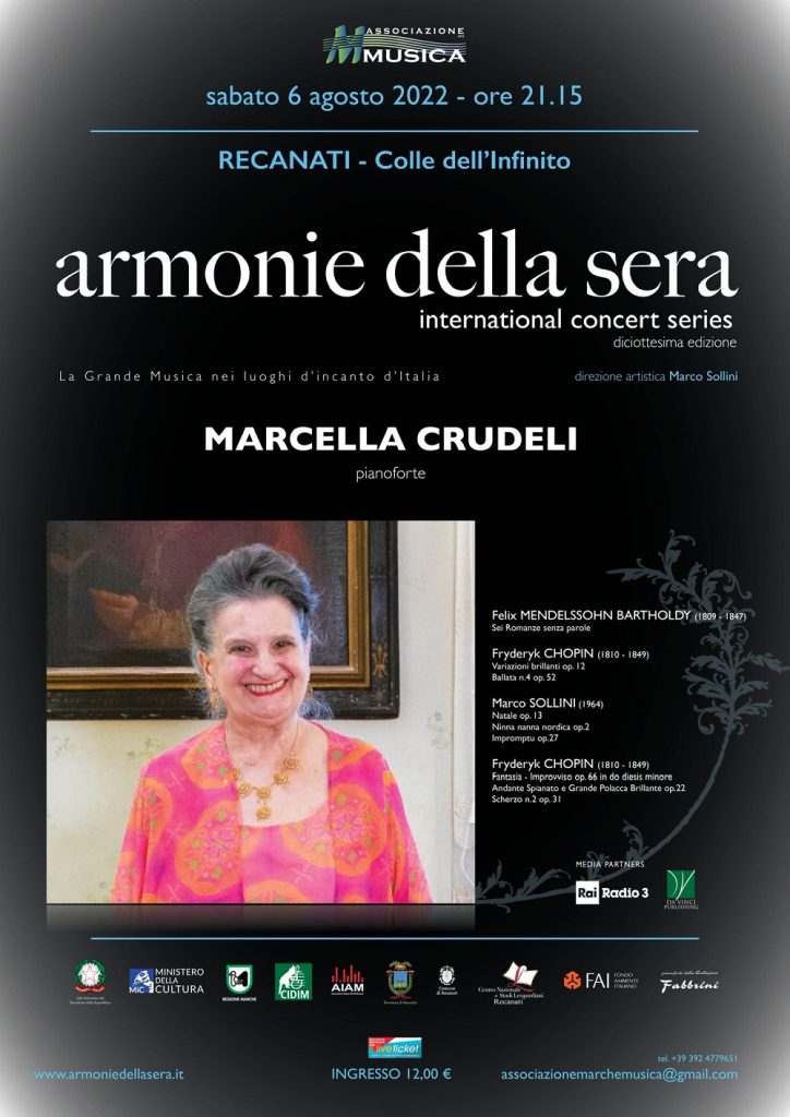 La grande pianista Marcella Crudeli, pluripremiata artista Cavaliere della Repubblica Italiana, ospite al Colle dell’Infinito del festival Armonie della Sera con un programma imperniato sul repertorio romantico con Mendelssohon e Chopin, sino alle opere contemporanee del M° Marco Sollini.