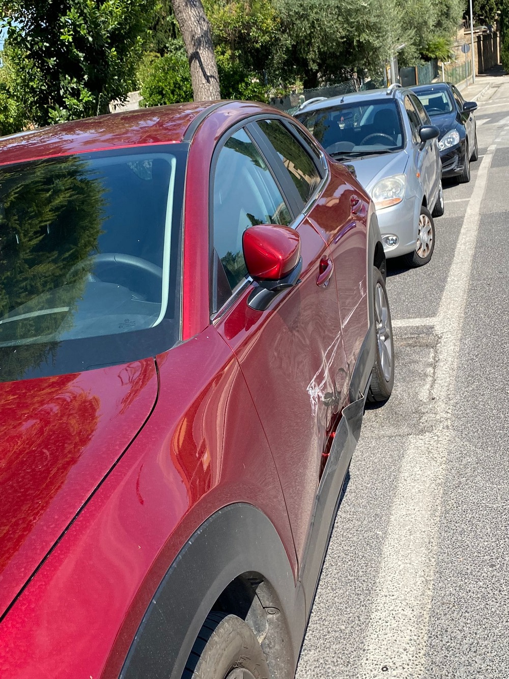 Ho lasciato la mia auto (nuova, neanche un anno di vita) in via Dalmazia all’intersezione con via Biagetti alle ore 10 e alle ore 14.30 l’ho trovata nelle condizioni che vedete nella foto, senza biglietto alcuno.