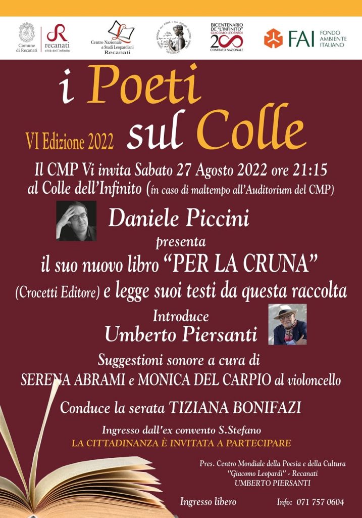 Dopo le serate del 24 luglio con la presentazione dell’Antologia “La Poesia delle Marche” curata da Guido Garufi, il 10 agosto con Luca Paci docente dell’Università di Cardiff che ha presentato l’Antologia bilingue italo-inglese “TEMPO” di poeti italiani nel Regno Unito, sabato 27 agosto, alle 21.15 sul Colle dell’Infinito, terzo ed ultimo appuntamento con una serata di poesia e musica “Un soffio nel Creato”.